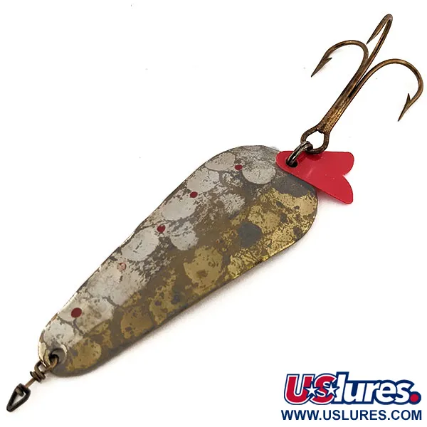Las muescas martilladas a mano en el cuerpo de latón revelan la artesanía suiza detrás de esta cucharilla vintage. Con un peso de 14g (1/2oz) y una longitud de 6cm (2 1/4"), este señuelo EGB Swiss made presenta un acabado dual Oro / Plata. La cara frontal está plateada y acentuada con pequeños puntos rojos, mientras que el reverso muestra la marca del fabricante estampada en el latón. Una aleta de plástico roja en forma de corazón está sujeta al anzuelo triple trasero, proporcionando un fuerte contraste visual. Este ejemplar, código de producto 12842, está en condición 4/5, mostrando un desgaste limpio propio de su edad en las superficies metálicas. Un esmerillón integrado está sujeto al ojal delantero, lo que lo hace apto para diversas modalidades de lanzado o curricán. La textura martillada es un detalle técnico característico de la marca EGB, diseñado para reflejar la luz en diferentes planos durante la acción de pesca.