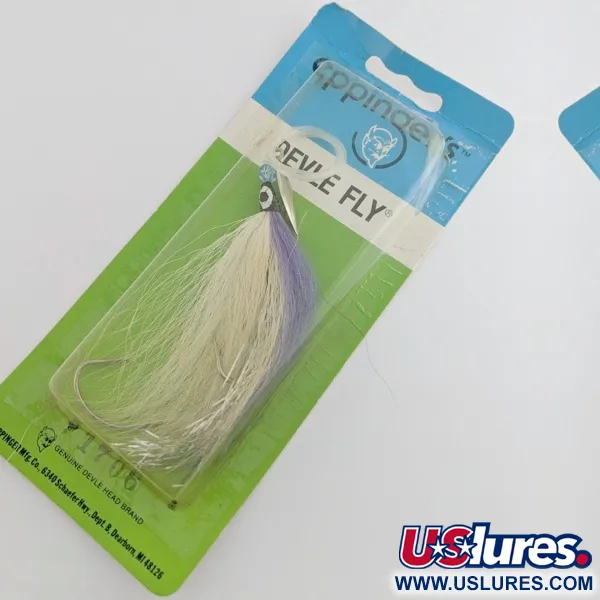 El pelo de ciervo (bucktail) morado y blanco proporciona el perfil visual principal de este aparejo de curricán especializado, un diseño que une una cucharilla tradicional y una mosca. Fabricado por Lou J. Eppinger Mfg. Co. en Dearborn, Michigan, el Devle Fly utiliza una hoja de metal de rotación libre sobre un eje para generar destellos mientras se remolca. Este ejemplar, identificado con el código de producto 24438, cuenta con una hoja con acabado en níquel combinada con un anzuelo montado en blanco y morado. Está diseñado para aplicaciones de curricán en aguas profundas, utilizándose frecuentemente junto con un flasher o atrayente para la pesca de trucha de lago y otros salmónidos. Encontrado en su embalaje original de cartón verde y azul, este señuelo permanece sin usar, con una calificación de estado de 6. El montaje incluye un anzuelo simple integrado en el bucktail para mantener un perfil hidrodinámico. Un detalle de ojo pintado en la parte de plomo de la mosca ofrece un punto de ataque específico situado detrás de la hoja de níquel giratoria.