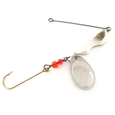 Con el nombre de la marca claramente estampado, la hoja con acabado de níquel brillante de este spinnerbait actúa como el principal atractivo visual. Con un peso de 1/2 oz (14 g), este Erie Dearie Walleye Killer, identificado con el código de producto 12120, es un ejemplo clásico de aparejo fabricado en EE. UU., diseñado específicamente para las técnicas de peso adelantado populares en los Grandes Lagos. La construcción presenta una cabeza en forma de pez blanca y plateada seguida de una secuencia de tres cuentas: dos en tonos vibrantes naranja y rojo y un pequeño espaciador metálico. Un anzuelo simple y afilado con acabado dorado está unido al extremo terminal, listo para ser montado con una lombriz, como es tradicional en este tipo de señuelo. El brazo de alambre es recto y está bien mantenido, terminando en un ojal limpio para la fijación directa de la línea. Este ejemplar está en condición 5/5, mostrando superficies limpias y sin signos de uso en los herrajes ni en el acabado de níquel.