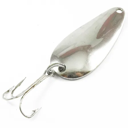 Estampado claramente en el lado cóncavo del metal se encuentra el nombre "EVANS", identificando esta cucharilla ondulante de 2 1/2" (6,5 cm) como una pieza clásica de la historia del equipo de pesca estadounidense de Glen Evans. Con un peso de 3/4 oz (21 g), el señuelo tiene un acabado en Rainbow Nickel brillante que ofrece una gran reflectividad para diversas claridades del agua. Este ejemplar, con el código de producto 3247, se conserva en un estado 4/5, mostrando una superficie bien cuidada que resalta su geometría en forma de lágrima. Los componentes incluyen un gran anzuelo triple unido mediante una anilla abierta resistente, diseñada para los rigores del lanzado pesado y la recogida. Un único orificio perforado con precisión en la cabeza proporciona un punto seguro para sujetar un clip o bajo de línea. El marcado estampado en el interior del cuerpo de la cucharilla sigue siendo nítido y legible, reflejando los estándares industriales de su fabricación en EE. UU.