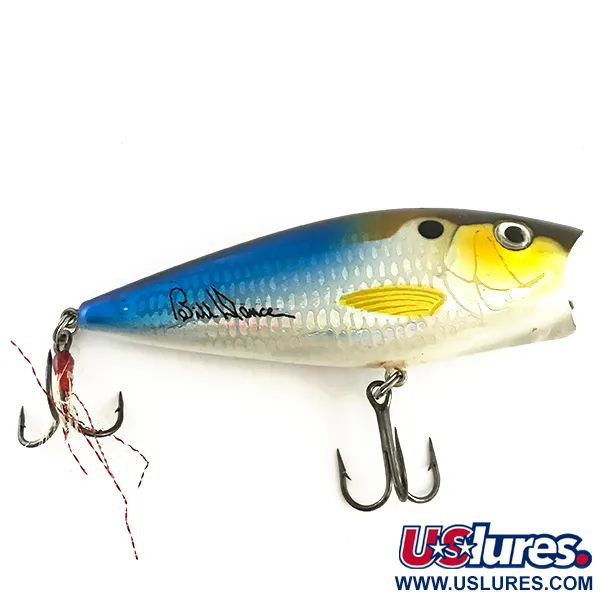 La firma del legendario pescador Bill Dance está grabada en el flanco de tonos azulados de este señuelo de superficie. Con una longitud de 8 cm (3 1/4"), el señuelo utiliza una boca cóncava para desplazar el agua en la superficie (0 m). Un peso de 12,5 g (2/5 oz) proporciona estabilidad para lances de larga distancia hacia las estructuras. Bajo el patrón de color Threadfin Shad, un acabado holográfico refleja la luz a través de los costados plateados con patrón de escamas, mientras que la garganta amarilla añade un contraste sutil. En la panza blanca, el código 6482 acompaña a la marca «Excalibur POP'N IMAGE» claramente impresa. El anzuelo triple trasero incluye plumas de hackle rojas y blancas diseñadas para provocar picadas cuando el señuelo está parado. Este ejemplar mantiene un alto nivel de conservación con una calificación de estado de 5/5.