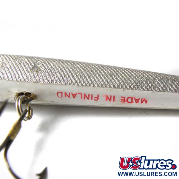 Una textura de escamas naturales recorre los 12 cm (4 3/4") de este minnow, reflejando la luz como un pez pasto real. La panza presenta un distintivo sello "MADE IN FINLAND" en tinta roja, que identifica claramente la artesanía de Finlandia Uistin. Este ejemplar, con código de producto 0216, luce un lomo gris carbón oscuro que contrasta con sus flancos plateados y un pequeño detalle rojo en la boca. Con un peso de 6 g (3/16 oz), el señuelo está equipado con un babero transparente de poca profundidad, ideal para el lance o la cacea en las capas superiores del agua. Los componentes están en excelente estado, con las poteras originales que le otorgan una calificación de conservación de 4/5. Su perfil estilizado y su auténtica fabricación finlandesa lo convierten en una pieza destacada para cualquier colección de señuelos europeos.