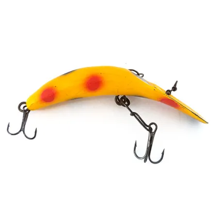Una base de pintura amarilla sirve como lienzo de alta visibilidad para las intensas manchas rojas y negras distribuidas en este Yakima Bait FlatFish X5. Con una longitud de 6 cm (2 1/4") y un peso de 7 g (1/4 oz), este clásico señuelo con forma de plátano es una pieza esencial de la historia de la pesca estadounidense. El patrón del código de producto 10995 presenta distintos puntos circulares rojos en los laterales y puntos negros más oscuros en la sección dorsal. Cuenta con la disposición tradicional de anzuelos desplazados de FlatFish, con dos poteras afiladas conectadas mediante cáncamos y separadores de alambre. Diseñado para alcanzar profundidades de 4 m (13 ft), este modelo se utiliza tradicionalmente para curricán lento o recogida lineal cuando se buscan truchas, black bass o lucios. El estado de este ejemplar específico está calificado como 4/5, mostrando un acabado bien mantenido con pequeñas marcas de uso. Los herrajes estampados y los detalles del acabado pintados a mano reflejan los estándares de fabricación de mediados de siglo de su origen USA.