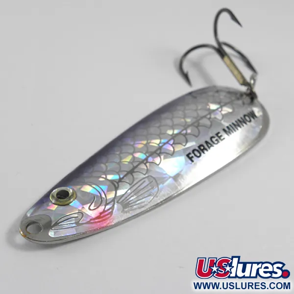 Un distintivo patrón de escamas de trucha arcoíris cubre la superficie reflectante de esta cucharilla metálica de 9 cm. Con un peso de 21 g, la Northland Forage Minnow está diseñada para ofrecer un perfil voluminoso durante el lance o el jigging vertical. Este ejemplar, identificado con el código de producto 1607, muestra la herencia estadounidense del fabricante con el nombre troquelado claramente visible sobre la textura holográfica. El montaje incluye un robusto anzuelo triple unido por una anilla abierta de confianza, ambos en perfecto estado. Un pequeño ojo impreso cerca de la parte superior del señuelo proporciona un punto focal realista, mientras que el reverso presenta un acabado plateado cóncavo pulido que emite destellos de luz por toda la columna de agua. Su construcción sólida está pensada para especies depredadoras que buscan presas de cuerpo ancho.