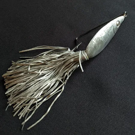 Los acabados plateados definen la estética de este ejemplar vintage, que presenta un prominente sello "Hawaiian" en su superficie metálica. Con un peso de 16g (3/5oz), el Fred Arbogast Hawaiian #3, identificado con el código de producto 20096, es un señuelo robusto diseñado para pescar en coberturas densas. El cuerpo mide 6 cm (2 1/4") e incorpora un anzuelo simple fijo protegido por un resistente protector antialgas de alambre. Un faldón grueso en tonos plateados aporta un volumen significativo al perfil, anclado firmemente detrás de la cabeza metálica en forma de lágrima. Originario de EE. UU., este señuelo muestra ligeras señales de su historia pero se mantiene en un estado 4/5 bien conservado, con el nombre del fabricante estampado aún claramente legible. El ojo está representado por un simple círculo en relieve en la cabeza, un sello distintivo del diseño de Arbogast de mediados de siglo. Los componentes de alta resistencia reflejan el enfoque tradicional de la marca en la durabilidad y funcionalidad para los pescadores de black bass.