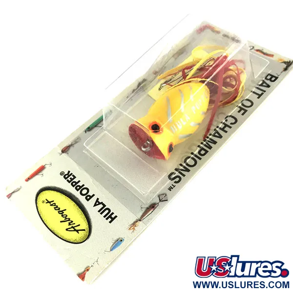 Un patrón de escamas amarillas y una boca cóncava de color rojo intenso caracterizan a este señuelo de superficie de 1/4 oz (8g). Con una longitud de 1 1/2" (4 cm), este ejemplar se mantiene sin usar en su blíster vintage original. La cara cóncava del Hula Popper fue diseñada por Fred Arbogast para crear una perturbación superficial distintiva, mientras que el faldellín de goma trasero —introducido por primera vez por la marca en 1941— imita el movimiento de patas o alas gracias a sus tiras de goma „respirables“. Este modelo específico, código de producto 9472, presenta un esquema de color vibrante diseñado para la pesca de superficie de alta visibilidad. El cartón trasero lleva el copyright de Arbogast de 1997 y describe la historia del señuelo como el „Bait of Champions“, destacando su eficacia para la pesca nocturna y el black bass de trofeo. En el reverso, el texto en francés e inglés resalta el marketing bilingüe utilizado para la distribución en Norteamérica. Estampado con el logotipo de Arbogast en el cuerpo amarillo, el señuelo conserva sus anzuelos originales de fábrica y herrajes metálicos seguros.