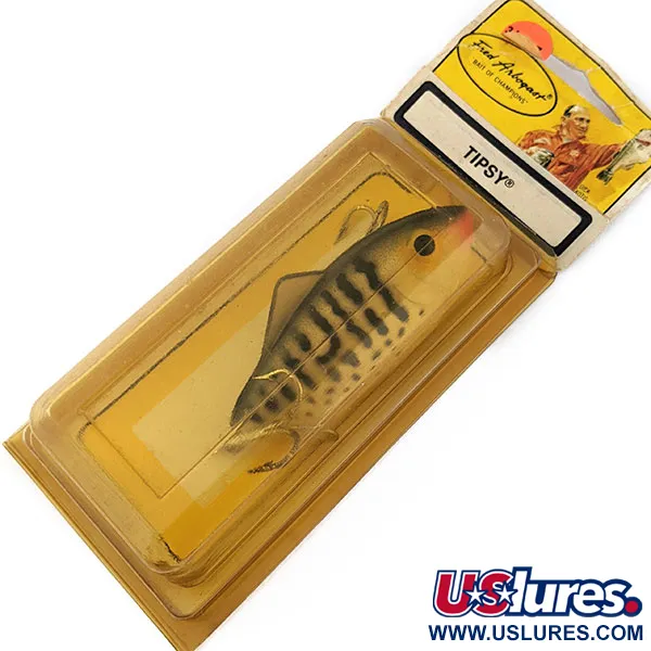 Intensas franjas verticales negras definen el patrón de color tiger de este ejemplar, que resalta sobre un cuerpo de tono canela amarillento con un toque naranja brillante cerca de la cabeza. Con un peso de 12 g (2/5 oz), el Fred Arbogast Tipsy se encuentra sin usar en su blíster vintage original. Con una longitud de 6 cm (2 1/4"), el señuelo está diseñado para nadar de lado, imitando a un pez herido. Esta rareza de fabricación estadounidense, bajo el código de producto 18750, mantiene el legado "Bait of Champions" característico de las colecciones privadas. El reverso del paquete muestra ilustraciones clásicas de la marca, vinculando su historia a la de señuelos legendarios como el Jitterbug. Sus anzuelos dorados están ubicados específicamente para facilitar esa natación lateral única.