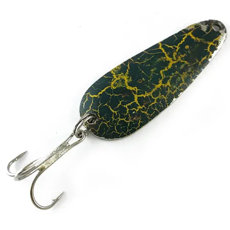 Un distintivo patrón de rana con acabado craquelado y reflejos amarillos sobre una base verde oscuro define el frente de esta cucharilla de 9 g (1/3 oz). Con una longitud de 5,5 cm (2 1/4"), el cuerpo de metal presenta un reverso de níquel pulido donde el nombre "GADABOUT GADDIS" está claramente estampado. Identificado con el código 6246, este señuelo es un representante clásico del equipo de pesca estadounidense de mediados de siglo asociado al legendario "Flying Fisherman". El señuelo está montado con una anilla abierta plateada y un robusto anzuelo triple. En su estado actual 4/5, muestra ligeras marcas superficiales en el acabado pintado, aunque el níquel permanece brillante y el estampado es muy nítido. Este espécimen fue diseñado para técnicas de lanzado en agua dulce, donde el contraste entre la parte superior oscura y la parte inferior reflectante es más eficaz.