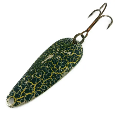 En la parte inferior de níquel pulido de esta cucharilla de 5,5 cm (2 1/4") aparece grabado el legendario nombre "GADABOUT GADDIS", en honor al famoso "Flying Fisherman" de mediados del siglo pasado. Con un peso de 9 g (1/3 oz), el señuelo presenta en su lado convexo un acabado Frog clásico, con una base verde oscuro y una textura craquelada en color oro amarillento. Este ejemplar, catalogado bajo el código de producto 9482, representa una era distintiva de los equipos de pesca fabricados en EE. UU. Los herrajes se mantienen originales, con una anilla abierta de alta resistencia y un anzuelo triple afilado con acabado en bronce. En cuanto a su estado, se califica con un 4/5, mostrando solo un ligero envejecimiento superficial que refleja su historia sin comprometer la integridad de la pintura o el metal. Estas cucharillas fueron popularizadas por Roscoe "Gadabout" Gaddis durante su carrera televisiva, diseñadas como herramientas versátiles para lanzado o curricán. El niquelado proporciona un destello brillante bajo la pintura texturizada, un detalle de construcción específico para ofrecer contraste visual bajo el agua.