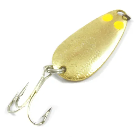 Un baño de oro y un acabado de escamas texturizado definen el perfil visual de esta cucharilla Glen Evans 576. Dos puntos amarillos distintivos se encuentran en el extremo más ancho del cuerpo, proporcionando un fuerte contraste de color contra la superficie metálica. El reverso presenta un sello claro que identifica la marca Glen Evans y el número de modelo 576, confirmando su fabricación estadounidense. Este ejemplar mide 4 cm (1 1/2") y pesa 5,5 g (3/16 oz), manteniendo una calificación de estado de 4/5 con superficies bien conservadas. El equipo incluye las anillas abiertas originales para la línea y un anzuelo triple sujeto al extremo estrecho, todo catalogado bajo el código de producto 3245.