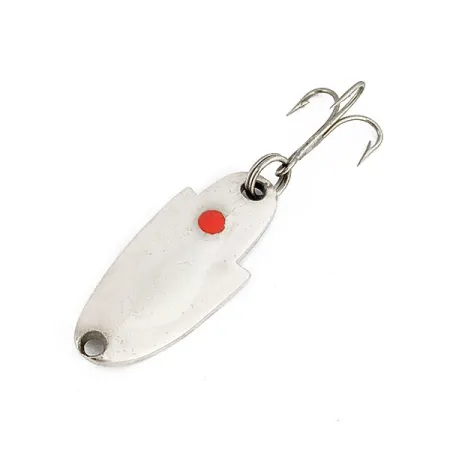 Con una longitud de 3,5 cm (1 1/2"), esta clásica cucharilla metálica refleja la filosofía de diseño funcional de Glen Evans. En el reverso se aprecia claramente el sello del fabricante "EVANS #561", que identifica este modelo específico dentro de su catálogo histórico. Su peso de 5,7 g (3/16 oz) la convierte en una opción versátil para equipos ligeros, ofreciendo la masa necesaria para lances controlados. En la parte frontal del cuerpo de color níquel destaca un único punto rojo, un activador visual común en los diseños de mediados de siglo para simular un punto de ataque. Su construcción incluye un sencillo orificio en la cabeza para la línea, mientras que la parte trasera utiliza una robusta anilla abierta para sujetar un anzuelo triple brillante. Con el código de producto 17984, este ejemplar mantiene un acabado limpio y reflectante, encontrándose en un estado de conservación 5/5.