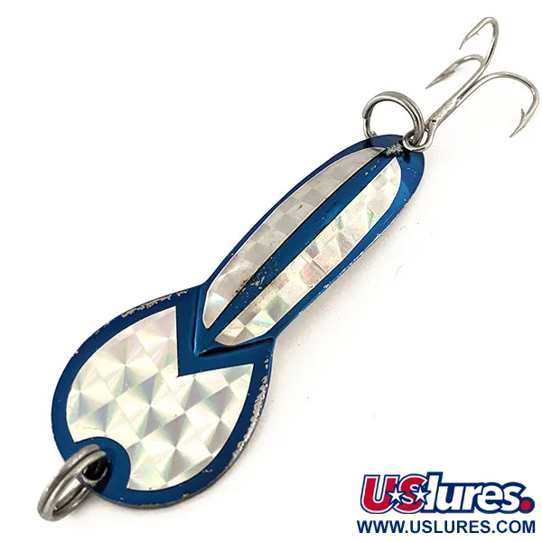 Una cara azul intenso acentuada por una brillante cinta holográfica plateada define esta clásica cucharilla de 17 g (3/5 oz). Parte del catálogo histórico de Glen Evans bajo el código de producto 13100, este espécimen mide 7 cm (2 3/4") y muestra el diseño que más tarde popularizaría Luhr Jensen. El frente presenta un distintivo inserto de prisma con patrón de diamante destinado a maximizar la visibilidad, mientras que el reverso está acabado en níquel altamente pulido con el sello „GLEN L. EVANS LOCO 3“ nítido y legible. Utilizado a menudo para la pesca de lucios en aguas poco profundas y tranquilas a profundidades de hasta 1 m, el señuelo es de construcción robusta tanto para el lance como para el curricán. Tanto la cabeza como la cola están equipadas con anillas abiertas, asegurando un anzuelo triple afilado en la parte trasera. Este artículo en particular se mantiene en condiciones 5/5, conservando su brillo original en las superficies de níquel y prisma.