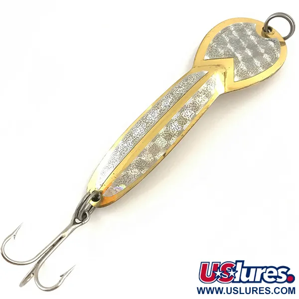 En el reverso lleva claramente grabado el sello «GLEN L. EVANS LOCO», que identifica este señuelo como una producción original del fabricante de Caldwell, Idaho, antes de que Luhr Jensen adquiriera la línea. Con una longitud de 9 cm (3 1/2") y un peso de 23 g (3/4 oz), esta cucharilla presenta un cuerpo dorado pulido con inserciones de cinta prismática holográfica que generan destellos multitono. Este ejemplar, identificado con el código de producto 5119, se encuentra en excelente estado (calificación 5/5). Conserva sus componentes originales, incluyendo un anzuelo triple afilado y la anilla abierta. Diseñado para lanzado o curricán, se utiliza habitualmente para pescar a profundidades de hasta 0,9 m (3 ft).