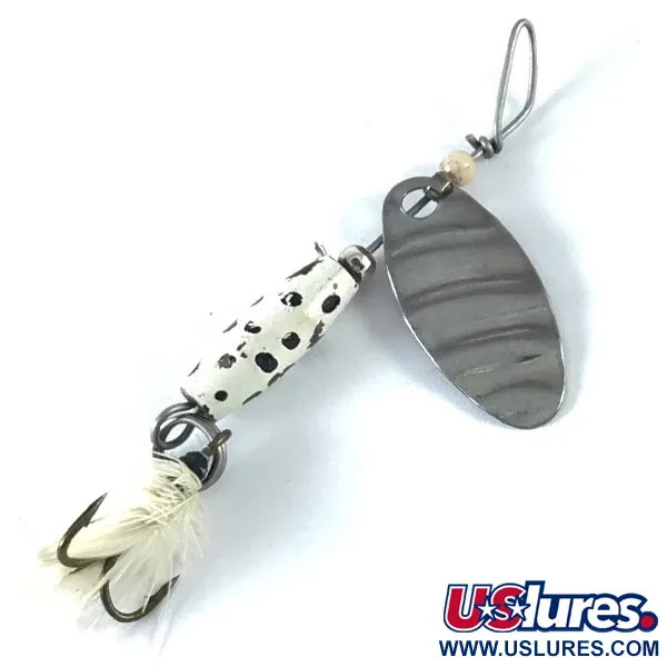 Un cuerpo blanco distintivo acentuado con audaces puntos negros identifica a esta clásica cucharilla, un diseño originalmente pionero de la compañía Glen Evans. Con un peso de 1/8 oz (4 g) y una longitud total de 2 1/4" (6 cm), la Shyster cuenta con un ojal de alambre descentrado diseñado para ayudar a controlar la torsión de la línea. Este espécimen específico, con el código de producto 3661, muestra una hoja plateada con las características estrías horizontales, un elemento básico de la fabricación de aparejos estadounidense antigua. El anzuelo triple trasero está adornado con plumas blancas, proporcionando un perfil visual más suave a la cola. Fabricada en EE. UU., la estructura sigue siendo robusta, y su estado 5/5 refleja una pieza muy bien conservada con un acabado limpio en todos sus componentes. A diferencia de muchas cucharillas en línea estándar, esta configuración es conocida entre los coleccionistas por su capacidad para funcionar eficazmente a bajas velocidades de recogida, tanto en corrientes de ríos como en lagos tranquilos.