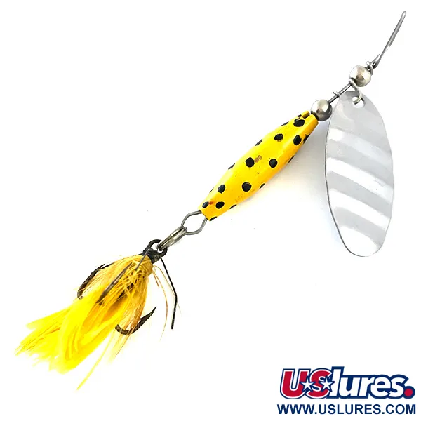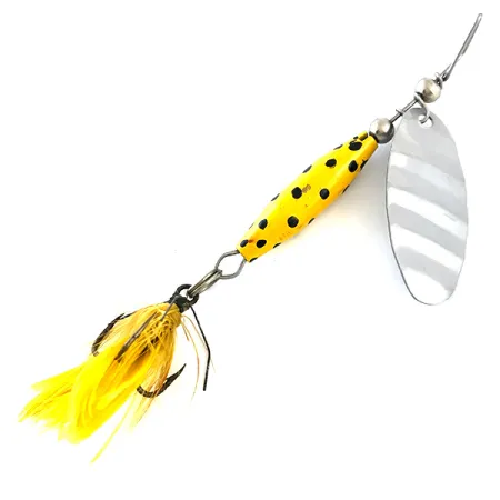 Destacando por su cuerpo amarillo vibrante y llamativos puntos negros, esta cucharilla giratoria representa una pieza de la historia de la pesca estadounidense del fabricante original Glen Evans. Con un peso de 1/4 oz (7 g) y una longitud total de 2 3/4" (7 cm), el ejemplar cuenta con una hoja de níquel pulido grabada con el nombre "Shyster" y la marca Glen Evans. Este artículo en particular, identificado con el código 5382, se conserva en estado 5/5 con pintura impecable y herrajes brillantes. Glen Evans fue pionero en este diseño en EE. UU. antes de que se convirtiera en un estándar fabricado por otras marcas famosas como Luhr Jensen. El diseño incluye un cuerpo lastrado y cónico junto a un anzuelo triple con plumas amarillas, una combinación utilizada históricamente para recogidas lentas tanto en aguas paradas como en corrientes. Las plumas de hackle amarillas se mantienen frondosas y bien sujetas al triple trasero.