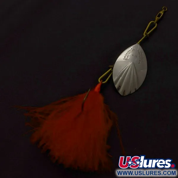 Un peso ligero de 1/4oz (7g) define a esta G.M. Skinner 4, un diseño cuya historia se remonta a una patente canadiense de 1874. La pala con acabado en níquel está elegantemente estriada para reflejar la luz y luce el icónico sello del fabricante que indica su origen en Clayton, N.Y. Con una longitud total de 4" (10cm), el montaje se apoya en un anzuelo vestido con plumas de color rojo anaranjado vibrante que aporta un toque de color al perfil metálico. El armazón de latón y el quitavueltas están impecables, otorgando a esta rareza una calificación de estado 5/5. Registrado con el código de producto 24225, el señuelo es una muestra de la precisión en la fabricación de materiales de pesca norteamericanos de antaño, destacando por su estriado único y su construcción robusta.
