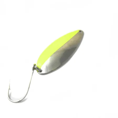 Un niquelado combinado con una vibrante franja verde define la estética de esta cucharilla ondulante americana vintage. Con unas medidas de 5,5 cm (2 1/4") y un peso de 11 g (2/5 oz), este modelo de Great Lakes Lures (código de producto 0435) es un ejemplo clásico de la artesanía estadounidense. Su construcción consta de un cuerpo de metal estampado con la parte inferior de níquel pulido, mientras que la parte superior se divide entre el metal desnudo y una sección pintada en verde brillante. Este ejemplar muestra un acabado bien conservado, con una calificación de estado de 4/5, presentando solo ligeras marcas superficiales en las zonas reflectantes. El anzuelo simple está fijado de forma segura mediante una anilla abierta reforzada en la cola, diseñada para el lanzado o el curricán en aguas abiertas. Este acabado bitono proporciona un contraste visual distintivo entre el alto brillo del níquel y la visibilidad del acento verde.