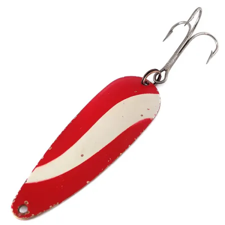 La parte posterior de cobre de este ejemplar presenta un sello "Gypsy King 0" nítido, que lo identifica como una creación clásica de Weller de los USA. Con una longitud de 6 cm (2 1/4") y un peso de 11 g (2/5 oz), el cuerpo metálico del señuelo muestra un patrón tradicional de rayas diagonales rojas y blancas en su cara convexa. Esta elección de pintura era fundamental para los pescadores de mediados de siglo que buscaban una alta visibilidad. El reverso revela el acabado de cobre original, que muestra ligeros signos de antigüedad acordes con su calificación de estado 4/5. Se ha fijado una potera simple en el extremo de la cola mediante una anilla abierta, mientras que la parte delantera cuenta con un orificio de fijación limpio. Identificada con el código de producto 10511, la construcción de la cucharilla destaca el trabajo de metal duradero típico de los equipos de pesca estadounidenses antiguos.