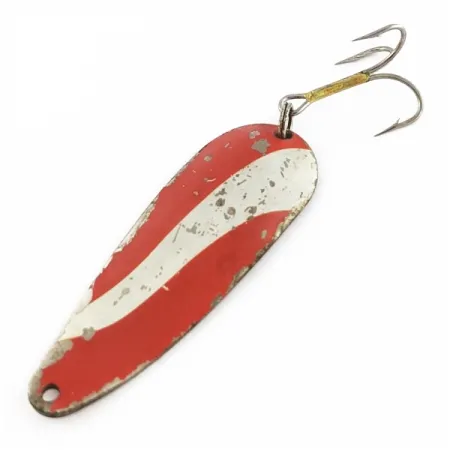 Con una longitud exacta de 6 cm (2 1/4"), esta cucharilla representa el modelo Gypsy King 0 de Weber, una marca con profundas raíces en la historia de los aparejos de pesca estadounidenses. El acabado consiste en un llamativo patrón de rayas diagonales rojas y blancas sobre una superficie niquelada, catalogado específicamente con el código de producto 24209. Con un peso de 11 g (2/5 oz), el señuelo muestra un desgaste visible con varios saltos de pintura y marcas superficiales en el cuerpo, lo que resulta en una calificación de estado de 4/5. Su construcción presenta un cuerpo metálico en forma de lágrima con un orificio troquelado para la línea y un robusto anzuelo triple asegurado por una anilla de alta resistencia en la parte posterior. Este señuelo fabricado en EE. UU. conserva sus componentes originales, incluido el sólido anzuelo triple de metal.