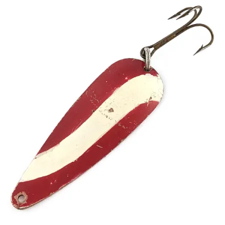 El chapado de cobre en el reverso sirve de base para el sello 'Gypsy King 1', que identifica esta pieza como una creación genuina de Weller fabricada en EE. UU. Con una longitud de 7 cm (2 3/4") y un peso de 17 g (3/5 oz), la cuchara está acabada con el icónico patrón de franjas diagonales rojas y blancas sobre el cuerpo metálico. Este ejemplar específico, identificado con el código de producto 22831, presenta un estado de conservación 4/5 con un ligero desgaste natural. Se aprecian pequeñas pérdidas de pintura cerca del ojal y en los bordes exteriores, donde se hace visible la base de cobre. El montaje incluye un duradero anzuelo triple bronceado unido mediante una anilla abierta de acero, diseñado para técnicas de lance. En la parte posterior, la tipografía de estilo manual de la marca y el sello del tamaño '1' proporcionan una conexión táctil con la producción de señuelos de mediados del siglo XX.