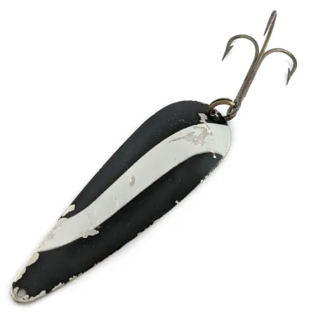 Con una longitud de 8,5 cm (3 1/4"), esta cuchara de metal estampada fabricada en EE. UU. presenta las marcas distintivas de Gypsy King. La cara frontal muestra un patrón de ondas pintado en blanco y negro de alto contraste sobre una base de níquel, con un desgaste visible acorde a su estado de conservación 4/5. Al girar el señuelo, se descubre un reverso de níquel pulido donde el nombre Gypsy King 2 está claramente grabado. Esta cuchara Weller, identificada con el código de producto 19599, conserva su anzuelo triple reforzado original y su anilla de conexión. Su forma de lágrima y su peso considerable de 21 g (3/4 oz) son características propias de un señuelo diseñado para el lance a gran profundidad o el curricán. Las ligeras pérdidas de pintura en los bordes aportan autenticidad a esta pieza de mediados de siglo sin comprometer su integridad estructural.