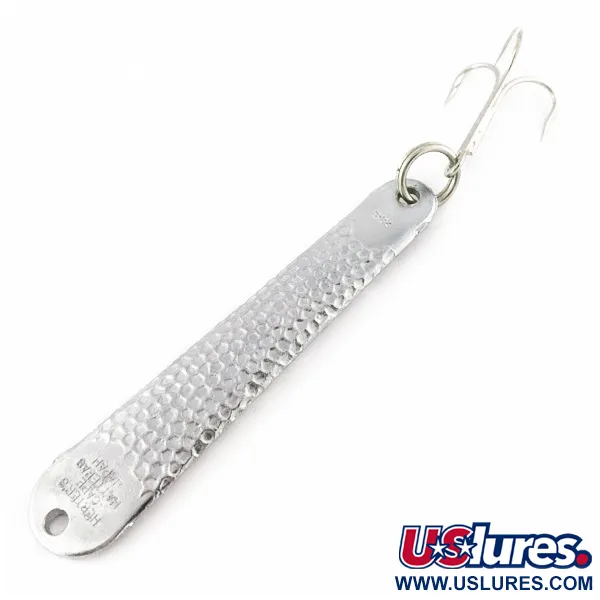 Con un peso de 1 1/2 oz (42 g), esta pesada cucharilla de níquel está diseñada para alcanzar grandes profundidades y para un uso intensivo en agua salada. Con una longitud de 10 cm (4"), el cuerpo presenta un acabado martillado distintivo diseñado para reflejar la luz, que transiciona hacia una sección lisa y estampada en la base. Este ejemplar específico, identificado con el código de producto 24356, representa la era de fabricación en la que la firma estadounidense Herter's Inc. importaba aparejos de alta calidad desde Japón para sus legendarios catálogos de venta por correo. La denominación Cape Hatteras hace referencia a las bravas aguas costeras de Carolina del Norte, destacando su diseño para la captura de grandes depredadores. El niquelado está notablemente limpio, con una calificación de estado de 5/5, y la identificación estampada "Herter's Cape Hatteras Japan" se mantiene nítida y perfectamente legible. Viene equipada con una robusta anilla abierta y un anzuelo triple brillante en la cola, mientras que la cabeza presenta un orificio limpio para el anudado de la línea.