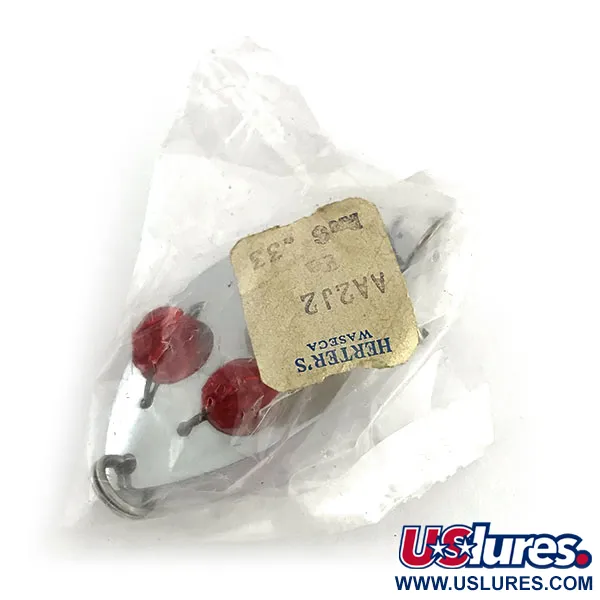 Ojos de vidrio rojo están engastados directamente en el cuerpo niquelado de esta cucharilla Herter's Glass eye spoon, una característica de diseño distintiva de la era posterior a la Segunda Guerra Mundial. Estos señuelos se fabricaron en el Japón ocupado para la emblemática marca estadounidense de actividades al aire libre, vinculando la producción mundial con sus raíces en Waseca, Minnesota. Con un peso de 11 g (2/5 oz) y una medida de 5,5 cm (2 1/4"), la cucharilla ofrece un perfil sustancial para el lanzado o curricán en agua dulce. El reverso presenta el nombre y la ubicación del fabricante estampados en el metal. Este ejemplar en particular está sin usar, aún conservado en su bolsa de plástico transparente original con la etiqueta de papel vintage marcada AA2J2 y un precio original de 33 centavos. El acabado en níquel permanece brillante y los dos insertos de ojos de vidrio rojo están firmemente asentados. Con el código de producto 8987, el señuelo incluye una anilla abierta en la cabeza para la conexión directa a un bajo de línea o emerillón.