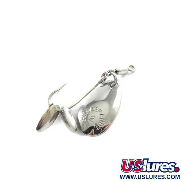 El niquelado proporciona un acabado limpio y reflectante en el cuerpo de 2,5 cm (1") de este spinner clásico. Con la marca « HILDEBRANDT 2 » grabada en la pala principal, esta creación de Yakima Bait es una pieza reconocible para cualquier entusiasta del ultra-light. Este ejemplar, código 1819, pesa 1,4 g (3/64 oz) y cuenta con un diseño de anzuelo simple. La inclusión única de dos pequeñas palas sónicas montadas directamente en la tija del anzuelo añade una capa mecánica distinta. Un esmerillón de barril está integrado en la parte superior para evitar la torsión de la línea. Calificado 4/5, las superficies de níquel permanecen brillantes y el grabado es nítido, con mínimos signos de antigüedad.