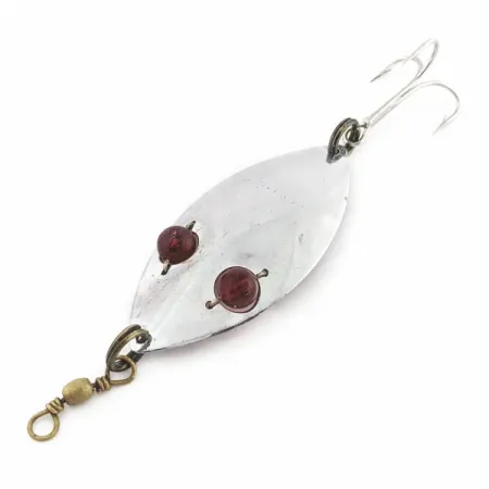 Los ojos de cristal rojo son el rasgo distintivo de esta cucharilla ondulante, actuando como punto de ataque para los depredadores durante la recogida lenta que requiere el lucio en verano. Con 3" (7,5 cm) y 1 oz (25 g), el cuerpo plateado lleva estampado el nombre Hofschneider y la dirección de Rochester, N.Y. Las dos cuentas rojas están ancladas a través del cuerpo, captando la luz para imitar a un pez herido sobre el acabado plateado brillante. En el reverso, el estampado incluye la patente nº 1,847,397. Este ejemplar tiene una calificación de 4/5, con una superficie reflectante limpia y herrajes originales. La cucharilla incluye un anzuelo triple trasero y un esmerillón en la punta. Código de producto 24579.