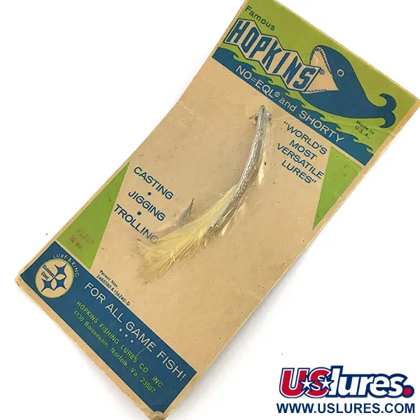 Con un peso de 1/4 oz (7 g), este ejemplar presenta el característico acabado de plata martillada sinónimo de la marca Hopkins. Esta cucharilla ondulante de 2 1/4" (6 cm) se conserva en su tarjeta vintage original, identificada con el código de producto 7694. La superficie texturizada está diseñada para reflejar la luz desde múltiples ángulos, una seña de identidad de la línea "Famous Hopkins" producida históricamente en Norfolk, Virginia. Este modelo 238 específico incluye un anzuelo simple con un trailer de bucktail pálido, y se encuentra en estado sin usar (6). Como se indica en el envase "No-EQL and Shorty", estos señuelos fueron diseñados para lanzado, jigging y curricán para todo tipo de peces de presa. La tarjeta destaca su fabricación en acero inoxidable, y el cuerpo metálico tiene el nombre de la marca estampado cerca del punto de enganche.