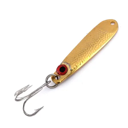 Un chapado en oro martillado cubre el grueso cuerpo metálico de este Hopkins Shorty 45, un diseño clásico que sigue siendo un elemento esencial para el jigging vertical y el lanzado tanto en agua salada como dulce. Con un peso de 1/2 oz (14 g), la densa construcción del señuelo permite alcanzar distancias considerables al lanzar desde la orilla o desde embarcación. Este ejemplar mide 2 1/4" (5,5 cm) y presenta una superficie con hoyuelos diseñada para reflejar la luz en múltiples direcciones. Un único ojo rojo prominente está situado cerca de la base, justo encima de la potera plateada asegurada por una anilla abierta de alta resistencia. Este señuelo fabricado en EE. UU. lleva el código de producto 10047 y mantiene un estado impecable de 5/5. La parte superior de la cuchara incluye un orificio pretaladrado para la fijación directa de la línea o para añadir una anilla abierta y flexibilizar el montaje.