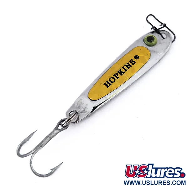 Un baño de níquel recubre el cuerpo de 5,5 cm de esta cucharilla de jigging fabricada en EE. UU. Con un peso de 11 g, el señuelo lleva el código de producto 10114 y presenta la marca distintiva 'SMOOTHIE' en una etiqueta azul-violeta vibrante. Un ojo amarillo proporciona un punto focal claro en la cabeza, contrastando con el acabado metálico pulido. Este ejemplar de Hopkins está en un estado 5/5, mostrando sus superficies originales y herrajes limpios. La cola está equipada con un robusto anzuelo triple, mientras que el morro incluye una grapa de fábrica para un montaje rápido en el agua.