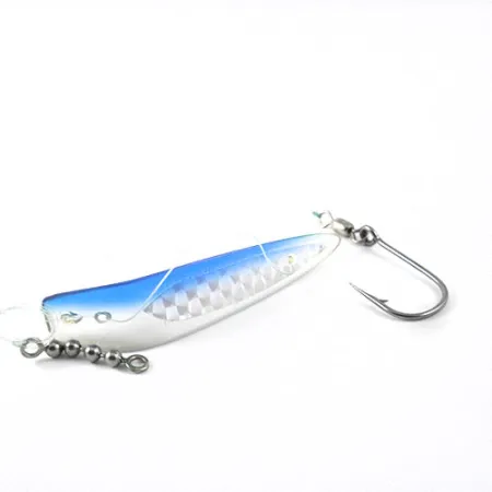 Con una longitud exacta de 3 1/4" (8 cm), este aparejo de curricán vintage es un excelente ejemplo de la artesanía de Luhr Jensen de EE. UU. Identificado con el código de producto 1170, el Hot Spot Apex 3 presenta una parte superior azul claro que transiciona hacia un lateral blanco detallado con un acabado de escamas reflectantes con patrón de diamante. Con un peso de 1/4 oz (7 g), el señuelo está montado con un bajo de línea de monofilamento conectado a un anzuelo simple afilado y una serie de esmerillones de bolas, herrajes esenciales para evitar la torsión de la línea durante el curricán. Al ser un ejemplar sin usar, conserva su acabado original de fábrica con una calificación de estado de 5/5. Su perfil curvo, similar al de una cucharilla, es característico de la serie Apex, diseñado para usarse detrás de excitadores como flashers o dodgers.