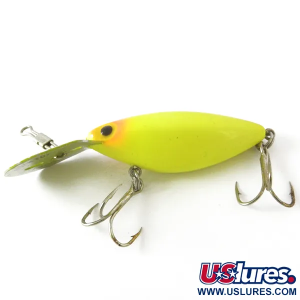 Una pintura amarilla vibrante define el acabado de este Storm Hot'N'Tot Thin Fin de 5 cm (2"), una pieza clásica de la producción estadounidense de la era pre-Rapala. Con un peso de 6,5 g (1/4 oz), el señuelo presenta un distintivo tono naranja alrededor de la cabeza y un perfil de lágrima aerodinámico. Este modelo flotante está diseñado para alcanzar profundidades de entre 1,5 y 4 m (5-13 ft) para pescadores que buscan percas, luciopercas o lucios mediante curricán y lanzado. Este ejemplar se conserva en excelentes condiciones, con una calificación de 5/5 por sus superficies limpias y componentes intactos. El hardware del código 3946 consta de anzuelos triples originales con acabado plateado y el característico babero metálico, que proporciona un movimiento errático de búsqueda manteniendo la estabilidad incluso en corrientes fuertes.