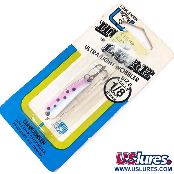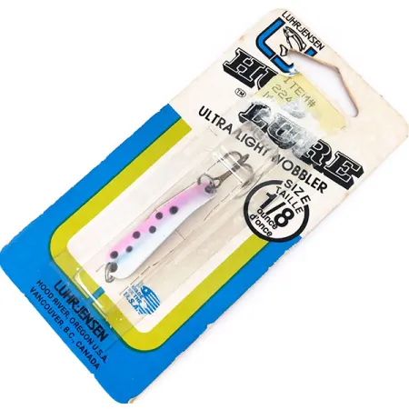 El niquelado proporciona la base reflectante para esta cucharilla metálica de 4g (1/8oz), diseñada para penetrar las corrientes superficiales y llegar a los peces apostados. Identificada con el código de producto 10383, esta Hus-lure luce un patrón de color Trucha con un sutil matiz rosa-púrpura y puntos negros marcados sobre el cuerpo plateado. Su cuerpo de 4cm (1 1/2") está moldeado para el lance, utilizando un perfil estrecho que soporta bien la tensión en arroyos o aguas paradas. Este señuelo está sin usar, conservado en su embalaje original de cartón azul y amarillo de la fábrica Luhr Jensen en Hood River, Oregón. Se mantiene equipado con sus componentes originales de fábrica, incluyendo una pequeña anilla abierta y un afilado anzuelo triple con acabado bronce. Cada detalle, desde el nítido troquelado de la marca hasta el blíster intacto, refleja la calidad del material de pesca estadounidense de esta época.