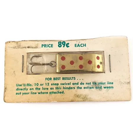Puntos rojos distribuidos sobre un cuerpo de latón pulido definen la estética de este Jake's Lures Lil Jake. Con un peso de 9 g (1/3 oz) y una longitud de 3,5 cm (1 1/2"), este señuelo fabricado en EE. UU. está diseñado con una forma única que mezcla las características de una cucharilla giratoria y una ondulante. Se mantiene sin usar, conservado en su blíster original sobre la tarjeta de venta de fábrica. La tarjeta vintage aún muestra el precio original de 89 centavos y ofrece consejos técnicos específicos, recomendando un quitavueltas con imperdible del n.º 10 o 12 para evitar el desgaste de la línea y asegurar la acción deseada. Con el código de producto 11197, este modelo cuenta con un anzuelo triple afilado unido mediante una anilla abierta.
