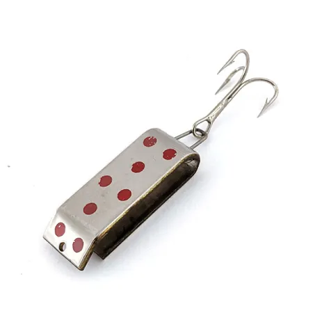 Siete llamativos puntos rojos están estampados sobre la superficie de níquel pulido de esta Jake's Lures Lil Jake, identificada con el código de producto 14705. Con una longitud de 3,5 cm (1 1/2"), este ejemplar fabricado en EE. UU. presenta una construcción única de metal plegado que la diferencia de las cucharillas planas tradicionales. El señuelo pesa 9 g (1/3 oz), ofreciendo un peso considerable para su tamaño que ayuda a alcanzar las profundidades deseadas durante el lance o el curricán. Se encuentra en un estado 5/5, mostrando un cuerpo reflectante muy limpio y una pintura roja bien conservada. Este diseño está concebido para una acción doble, combinando un movimiento oscilante con el destello de una cucharilla para atraer truchas y salmones en aguas claras. Monta un anzuelo triple resistente en la parte trasera, mientras que la parte frontal ofrece un punto de enganche directo y sencillo para la línea de pesca.