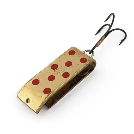 Puntos rojos destacan sobre un acabado dorado clásico en este señuelo metálico vintage de 3,5 cm (1 1/2"). Identificado con el código de producto 18180, este ejemplar presenta un diseño único de placa doblada que combina las propiedades de una cucharilla y un spinner. Con un peso de 9 g (1/3 oz), el Lil Jake está equilibrado para lanzamientos precisos en arroyos o lagos. Este señuelo fabricado en Wyoming, EE. UU., muestra señales de un manejo cuidadoso, con una calificación de estado de 4/5. El chapado en oro conserva un brillo intenso en todo el cuerpo rectangular, que presenta una curva pronunciada cerca del punto de amarre. Un anzuelo triple oscurecido está sujeto de forma segura mediante una anilla abierta robusta en la parte trasera, reflejando la utilidad práctica común en las primeras producciones de Jake's Lures.