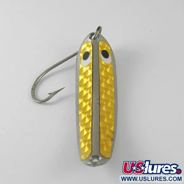 Unos ojos grandes en blanco y negro de alto contraste están situados en la cabeza del cuerpo de 7 cm, creando un punto focal llamativo para la Jig-A-Whooper Hawgler spoon #6. Este señuelo de HT Enterprises, catalogado bajo el código de producto 1019, presenta una forma metálica curva con un patrón de escamas holográficas amarillas brillantes aplicado en la superficie frontal. Al dar la vuelta al jig, se descubre una parte posterior plateada limpia con el nombre del modelo estampado, mostrando su origen estadounidense. Con un peso de 21 g, el señuelo está diseñado para el jigging vertical y presentaciones en aguas profundas. El hardware incluye un robusto anzuelo simple unido mediante un anilla abierta en la cola y un enganche para la línea preperforado en la cabeza. En su estado 4/5, la capa holográfica reflectante y el baño de plata permanecen brillantes y bien conservados para ser un espécimen vintage.