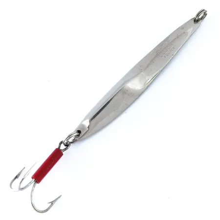 Grabado claramente en el metal niquelado se encuentra el identificador "JOHNSON LUJON 1", que marca este señuelo como una pieza genuina de la historia de la pesca estadounidense. Con 31 g (1 oz), el cuerpo pesado y esbelto del señuelo está construido específicamente para el jigging vertical en aguas profundas o para lanzamientos a larga distancia contra el viento. El perfil de 9 cm (3 1/2") presenta un giro asimétrico único en el metal, un sello distintivo del diseño destinado a captar la luz desde múltiples ángulos. Este ejemplar se mantiene en una condición limpia de 4/5, mostrando el acabado de níquel de alta calidad por el que Johnson era conocido durante sus años de producción en USA. Un detalle notable es el tubo rojo brillante en la tija del anzuelo triple, que sirve como un punto de ataque visual clásico para los depredadores. Equipado con anillas abiertas de alta resistencia tanto en la cabeza como en la cola, este señuelo, código de producto 11094, refleja la construcción robusta de los aparejos de jigging de mediados de siglo.