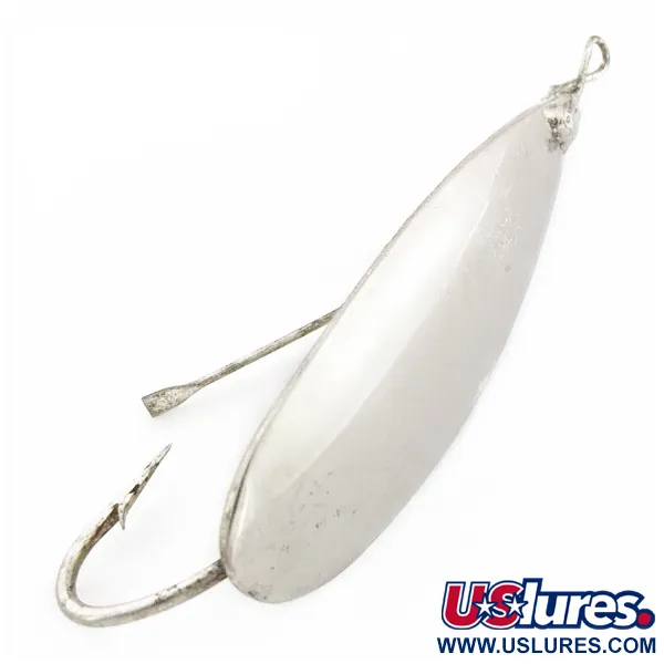 Con una longitud de 6 cm (2 1/4"), esta clásica cucharilla ondulante cuenta con el protector antialgas característico diseñado para navegar en vegetación densa. Un anzuelo robusto está soldado directamente al cuerpo con acabado de níquel, lo que garantiza que la punta permanezca hacia arriba durante la recogida para minimizar los enganches. Con un peso de 12 g (2/5 oz), el metal es más grueso a lo largo de la línea central para proporcionar estabilidad y una acción distinta sin retorcer la línea. Este ejemplar específico lleva el sello "Made in USA", lo que lo distingue de la producción moderna fuera del país. El perfil de lágrima de la cucharilla permite lances largos en lechos de algas o nenúfares donde se esconden los depredadores. Originalmente fue diseñada para pescarse sola o combinada con un tráiler de piel de cerdo para añadir volumen y movimiento. El estado se califica como 5/5, mostrando el acabado brillante y los herrajes intactos de un señuelo vintage bien conservado. Código de producto: 24556.