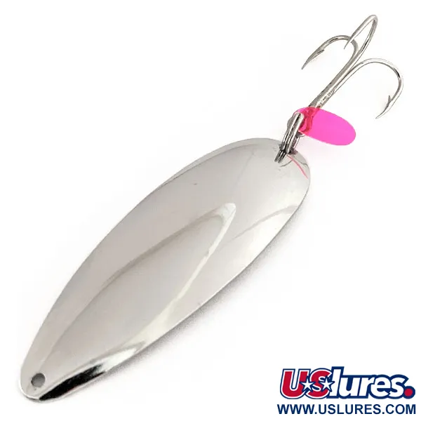 Un peso clásico de 1/2 oz (14 g) convierte a este espécimen en una opción versátil para el lanzado o el curricán ligero en diversas capas de agua. El acabado de níquel pulido proporciona un destello de alto contraste, una característica distintiva de los antiguos señuelos Johnson Sprite fabricados en EE. UU. antes de que la producción se trasladara al extranjero. Identificado por el código de producto 11256, este señuelo representa una era de artesanía nacional que los colectores valoran por su calidad de materiales. El nombre 'Johnson Sprite' está claramente estampado en el metal en el reverso, proporcionando una marca auténtica para cualquier colección de aparejos antiguos. Una pequeña y vibrante lengüeta atractora de plástico rojo está montada en la anilla junto al anzuelo triple, creando un punto focal visual definido contra el cuerpo plateado. Con una medida de 2 3/4" (7 cm), el perfil de lágrima de la cucharilla está diseñado para un rendimiento constante. Este artículo se encuentra en excelentes condiciones, con una calificación de 5/5 por su superficie brillante como un espejo y sus herrajes originales bien conservados.