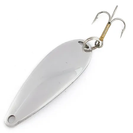 El baño de níquel proporciona un acabado tipo espejo en toda la superficie de esta cucharilla con forma de lágrima. Con un peso de 1/3 oz (10 g), el cuerpo metálico mide 2 1/4" (6 cm) y presenta un orificio de sujeción limpio y preperforado en el extremo más estrecho. El lado cóncavo del metal está grabado con «JOHNSON'S SPRITE», lo que confirma su origen como una pieza genuina de fabricación estadounidense bajo el código de producto 22446. Una robusta anilla abierta conecta el anzuelo triple, que cuenta con un distintivo collarín en tono latón en la tija. Cada detalle de este ejemplar es nítido, desde los bordes suavizados del fundido hasta el brillante color níquel, mostrando que se mantiene sin usar. Johnson diseñó este perfil específico para una utilidad versátil, siendo apta tanto para lances precisos hacia coberturas como para el curricán en aguas abiertas.