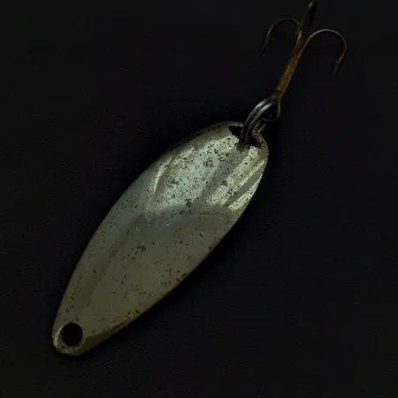 El nombre "JOHNSON'S SPRITE" grabado con claridad en el metal identifica a esta cucharilla de 5 cm (2") como un elemento clásico de las cajas de pesca estadounidenses de mediados de siglo. Con un peso de 7 g (1/4 oz), su cuerpo de color dorado presenta una silueta de lágrima delgada y alargada, diseñada para lograr lances eficientes. Este ejemplar, identificado con el código de producto 22509, muestra signos visibles de uso y antigüedad en su superficie metálica, correspondientes a una calificación de estado 3/5. Fabricado en EE. UU., el señuelo está equipado con un anzuelo triple bronceado sujeto por una anilla abierta resistente en la parte posterior. El acabado dorado reflectante está diseñado para ofrecer una alta visibilidad en diferentes grados de claridad del agua, mientras que el único orificio frontal para la línea se mantiene limpio y funcional para un montaje directo.