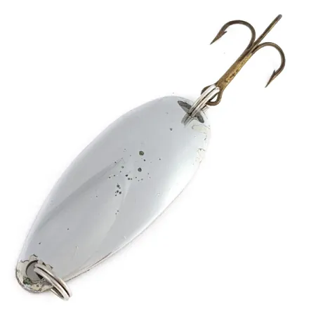 Con un peso de 1/3 oz (10 g), el cuerpo de metal estampado de esta cucharilla conserva el legado de la fabricación de señuelos estadounidense. En su parte posterior se aprecia claramente el grabado 'JOHNSON'S SPRITE', sello distintivo de la Louis Johnson Company. Con una longitud de 2" (5 cm), el acabado en níquel se mantiene brillante, aunque muestra un desgaste superficial lógico y pequeñas manchas propias de su estado de conservación 4/5. Esta pieza vintage, registrada con el código 22550, viene equipada con anillas abiertas de estilo original y un robusto anzuelo triple con acabado en bronce. Su perfil en forma de lágrima es algo más grueso en la parte inferior, concentrando la masa para maximizar la distancia de lance.