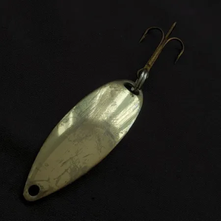 Un baño de oro cubre el cuerpo en forma de lágrima de 5 cm (2") de esta cucharilla de casting vintage. Fabricada en EE. UU., la Johnson Sprite tiene un peso versátil de 7 g (1/4 oz), lo que la convierte en una opción sólida para tentar a peces depredadores en diversas capas de agua. La superficie interna cóncava presenta un sello nítido de "JOHNSON'S SPRITE", una marca distintiva de la producción de mediados de siglo de la firma. Su montaje incluye un anzuelo triple duradero sujeto por una anilla abierta resistente en la parte trasera, mientras que el morro dispone de un ojal perforado para el atado directo de la línea o conexión mediante clip. Bajo el código de producto 22722, el señuelo muestra una valoración de estado de 4/5, con sutiles signos de uso que le otorgan carácter sin comprometer la integridad de su acabado metálico. El exterior pulido proporciona un perfil de destellos intensos apto tanto para lances como para la pesca al curricán.