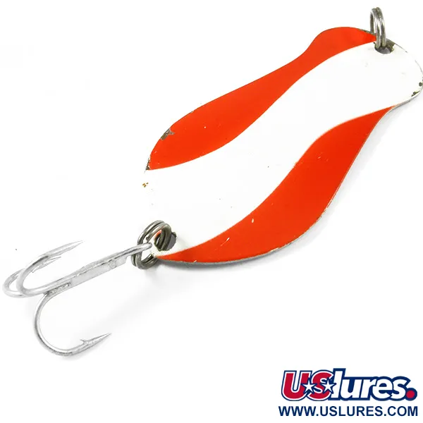 El níquel pulido en el reverso presenta un sello claro que identifica este ejemplar como un K-B Amasa, Mich. tamaño 2. Con una medida de 6,5 cm (2 1/2") y un peso de 14 g (1/2 oz), la K-B Spoon 2 es un elemento robusto de la historia de la pesca de Michigan, a menudo descrita por los pescadores estadounidenses como un señuelo para capturar grandes peces. La cara convexa está decorada con un patrón clásico de rayas onduladas rojas y blancas sobre una base blanca limpia, un esquema de alta visibilidad diseñado para el lucio y el muskie en diversas condiciones de agua. Bajo el código de producto 3263, esta cucharilla conserva sus componentes originales, incluyendo dos robustas anillas abiertas y un anzuelo triple afilado con acabado plateado. Este artículo específico se encuentra en excelente estado, con una calificación de 5/5 por su pintura bien conservada y su acabado metálico reflectante. Fabricado por K-B Bait Co. en los EE. UU., su sólida construcción es adecuada tanto para el lanzado como para el curricán. El "2" estampado en la parte posterior corresponde a la clasificación de tamaño utilizada por el taller de Amasa durante sus años de producción.