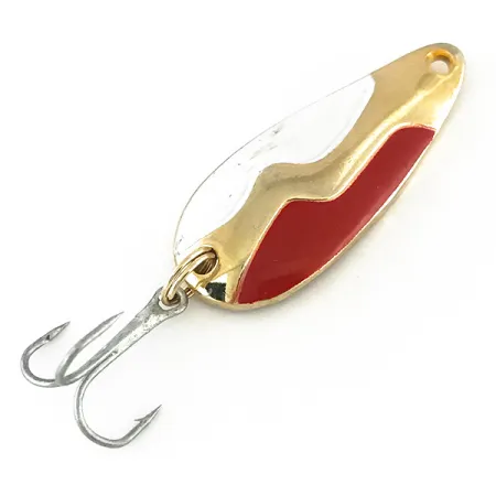 Claramente grabado en el reverso de oro pulido de esta cucharilla de 4,5 cm se encuentra la marca Kamlooper, identificándola como un señuelo Acme auténtico fabricado en EE. UU. Con un peso de 11 g, la cucharilla presenta un patrón tricolor distintivo en su cara, donde las secciones en blanco y rojo sólido están divididas por una banda ondulada dorada central que recuerda al perfil de una montaña. Este ejemplar específico, con el código de producto 8215, muestra el perfil clásico en forma de lágrima diseñado para aplicaciones de lance y curricán. Su estado está calificado como 5/5, con las superficies pintadas manteniendo su acabado de alto contraste y el interior bañado en oro mostrando una calidad brillante y reflectante. Su herraje original está intacto, con un anzuelo triple de color plateado sujeto por un anillito abierto reforzado en la cola. Las letras grabadas en el reverso son nítidas y legibles, confirmando su identidad como Kamlooper Spoon junto a un ojal de sujeción limpiamente perforado en el borde delantero.