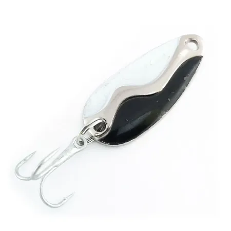 Con un peso versátil de 7 g (1/4 oz), esta cucharilla de fabricación estadounidense presenta un llamativo diseño tricolor en su cara convexa. El acabado se divide entre esmalte liso blanco y negro, separados por una línea ondulada de níquel pulido distintivamente curva que recorre todo el cuerpo. Con una longitud de 3,5 cm (1 1/2"), esta creación de Acme, identificada por el código 9801, lleva el nombre del fabricante y el sello del modelo claramente en el reverso. El patrón de alto contraste Negro / Blanco / Níquel proporciona un destello visual significativo al lanzar o pescar al curricán. En cuanto al herraje, está equipada con una anilla abierta robusta y un anzuelo triple limpio y afilado. Este ejemplar se encuentra en excelente estado, con una calificación de 5/5, manteniendo la pintura y el niquelado su brillo original. Fabricada en EE. UU., su manufactura destaca el trabajo duradero en metal y el acabado de calidad característico de los equipos clásicos de Acme.