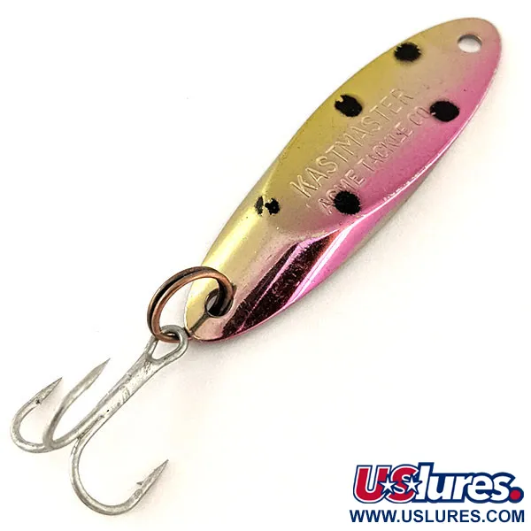 El niquelado proporciona la base para este señuelo de 4,5 cm (1 3/4"), donde la cara superior muestra un llamativo degradado de Trucha Arcoíris. El sello "KASTMASTER ACME TACKLE CO." identifica su origen estadounidense, reflejando la calidad de mecanizado de la aleación de latón original. Con 7 g (1/4 oz), este modelo con código 12312 está diseñado para ser versátil, utilizándose a menudo tanto para jigging en aguas profundas como para recogida lineal en corriente. En cuanto al acabado, la pintura transita suavemente de un amarillo dorado en la parte delantera a un tono rosa intenso en la cola, con cinco puntos negros que imitan a un alevín. El estado tiene una calificación de 5/5, mostrando una parte inferior de níquel pulido impecable y un anzuelo triple original afilado. El equilibrio específico entre el grosor del metal y el corte cónico define el estándar de Acme para la serie, asegurando que el señuelo trabaje correctamente durante el descenso. Una anilla abierta resistente sujeta los componentes plateados, mientras que el ojal de atado está limpio de residuos.